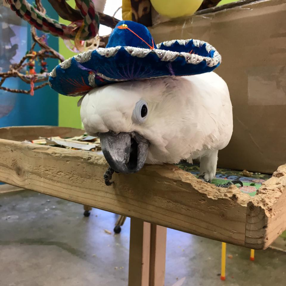 Kiwi’s favorite things in the world are, pizza crust, cheddar cheese, cheese enchiladas that he steals from Dawn, cheese crackers, French fries, quick links, our toy vendor Bev, and screaming profanities when he’s outside. Kiwi’s least favorite things are open toed shoes, small children, showers, another resident cockatoo named Orlando, and anyone holding a broom or mop. If you see Kiwi on the floor, call for an employee, then grab the nearest child and run the other direction. We have a saying that you’re never truly a Tropic Zone employee until you’ve been bitten by Kiwi. In all seriousness, we love Kiwi. He’s not as bad as he sounds,. He can be incredibly sweet, and if he likes you, you’re his best friend. If he doesn’t like you, there is no changing his mind. He’s not a psycho, he’s just a cockatoo.