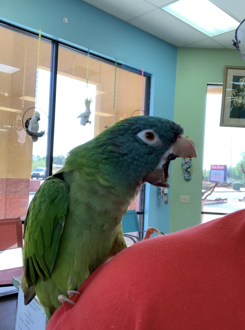 In typical Blue-Crowned Conure fashion Jessie is very dramatic. He absolutely HATES the Post Office, UPS and FedEx trucks. If one of them parks on the south side of the building outside of the window, he screams at them. If you have food at the cash register and you don't offer it to him, he will let you know he's not happy with you. Sometimes you'll see him hang almost totally upside down to get your attention when you're eating.